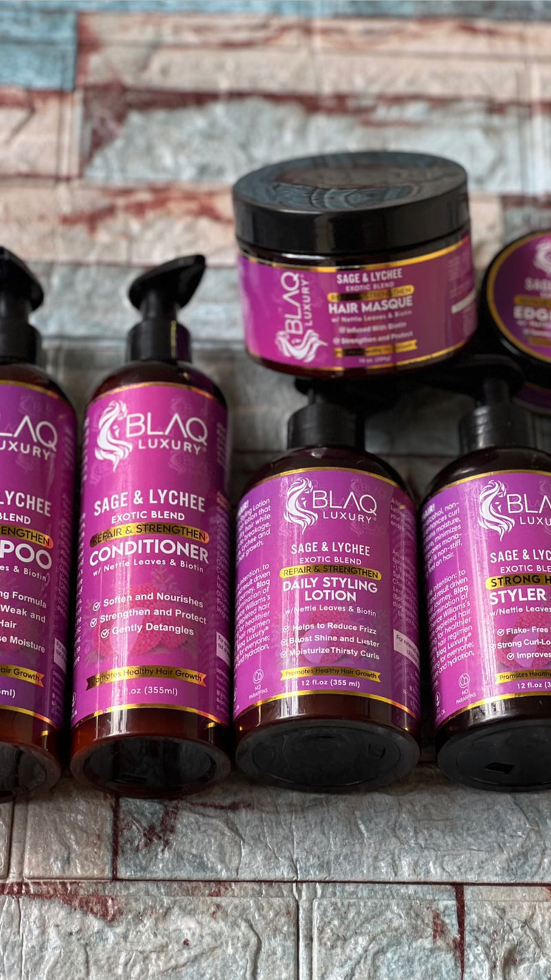 Blaq Luxury® Repair & Strengthen Daily Styling Lotion est une lotion capillaire ultra hydratante et anti-frisottis qui restaure l'hydratation et la souplesse des cheveux secs tout en augmentant la brillance et la résistance des cheveux à la casse. Cette lotion coiffante est infusée de sauge, de litchi et d'ortie pour favoriser une croissance de cheveux forte et saine. Si cela ne suffit pas, ça sent aussi incroyablement bon. Donnez à vos cheveux la nourriture qu'ils méritent chaque jour avec notre lotion coiffante quotidienne à la sauge et au litchi dès aujourd'hui !